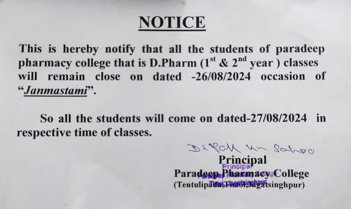 Well come to Paradeep Pharmacy College, Tentulipada, Tirtol,Jagatsinghpur, I feel proud to note that our college has been providing training and education in numerous facets of pharmacy curriculum over past three decades through making ready first-class pharmacists with professional competencies to attain developing demand of health specialists in our healthcare device. The college offers splendid infrastructural facilities along with nicely modernized classrooms, laboratories, library, and net facility as in line with the necessities of the statutory bodies. ....Read More